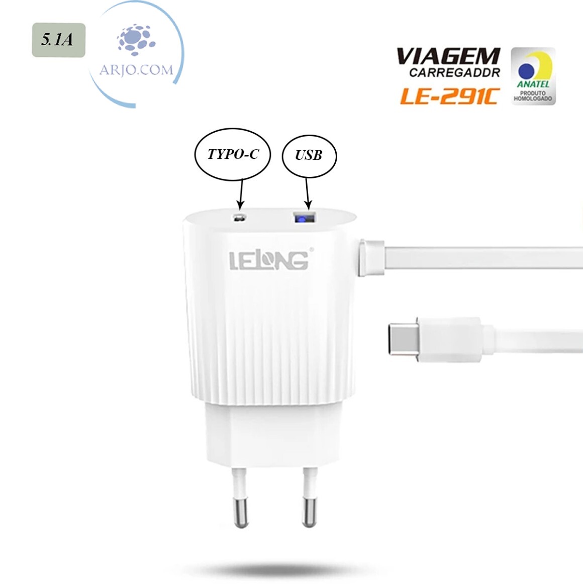CARREGADOR TIPO-C COM 2 PORTAS USB 5.1A (LE-291C)