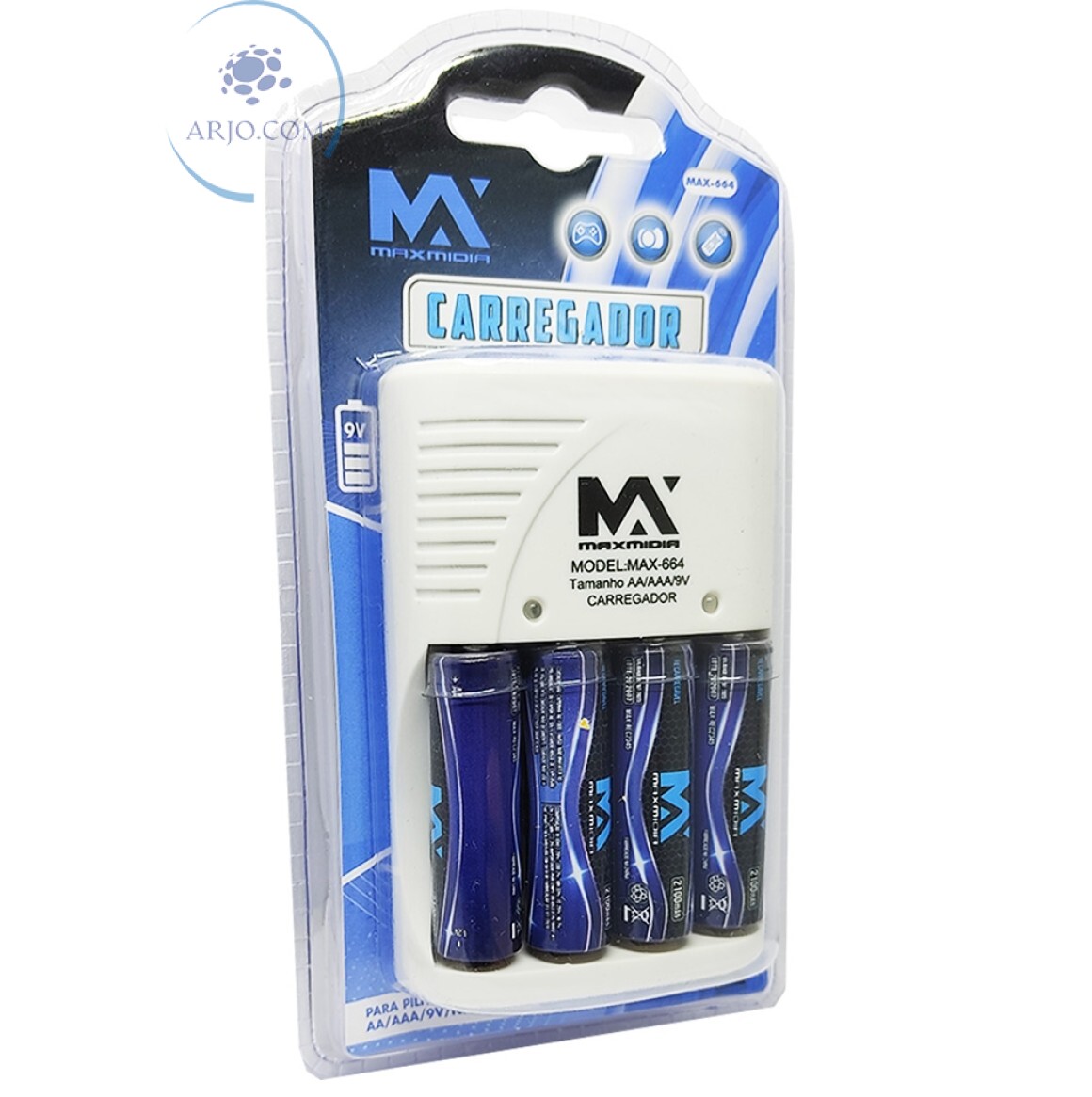 CARREGADOR DE PILHA COM 4 PILHAS AA 2100mAh (MAX-664)