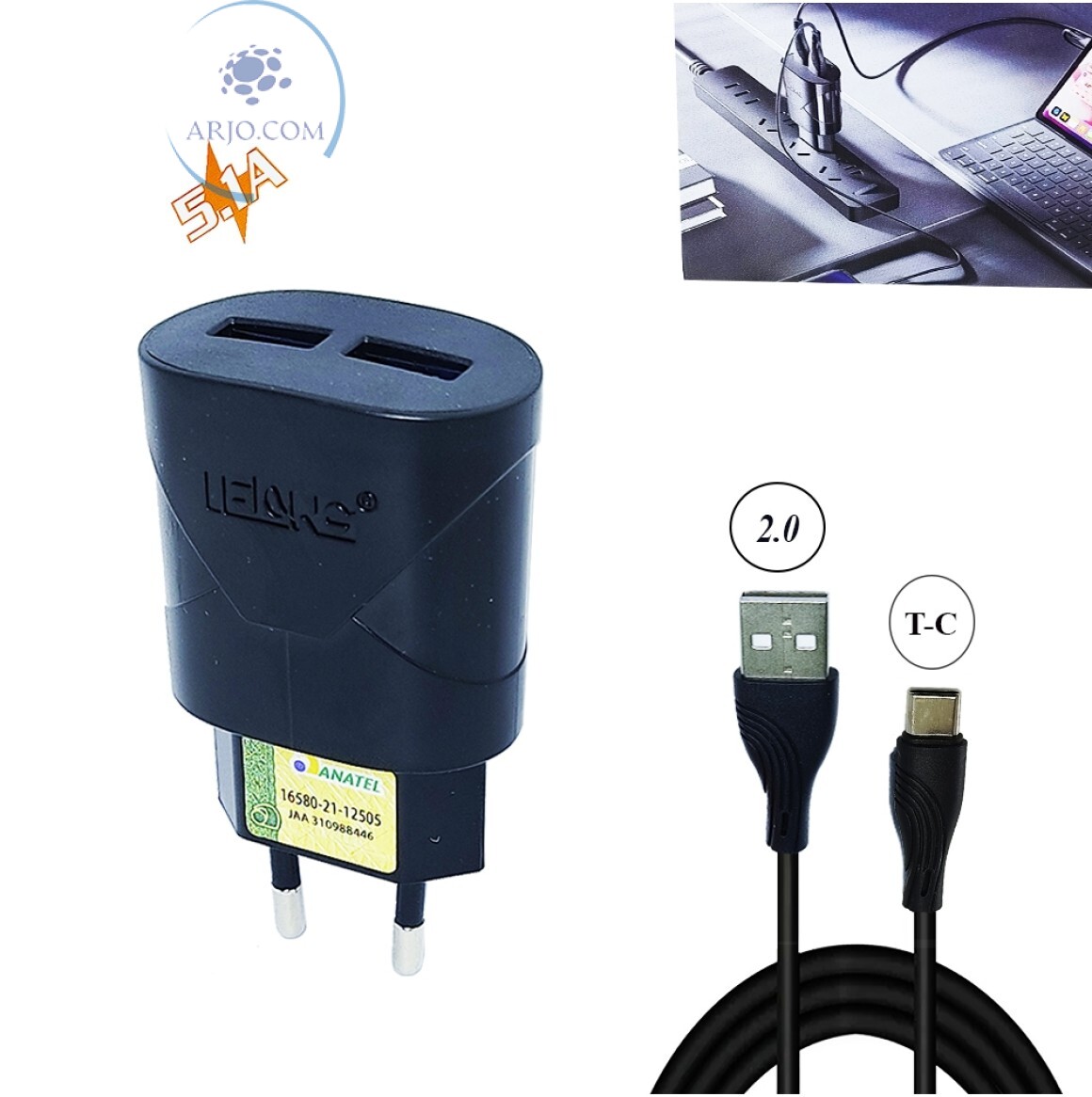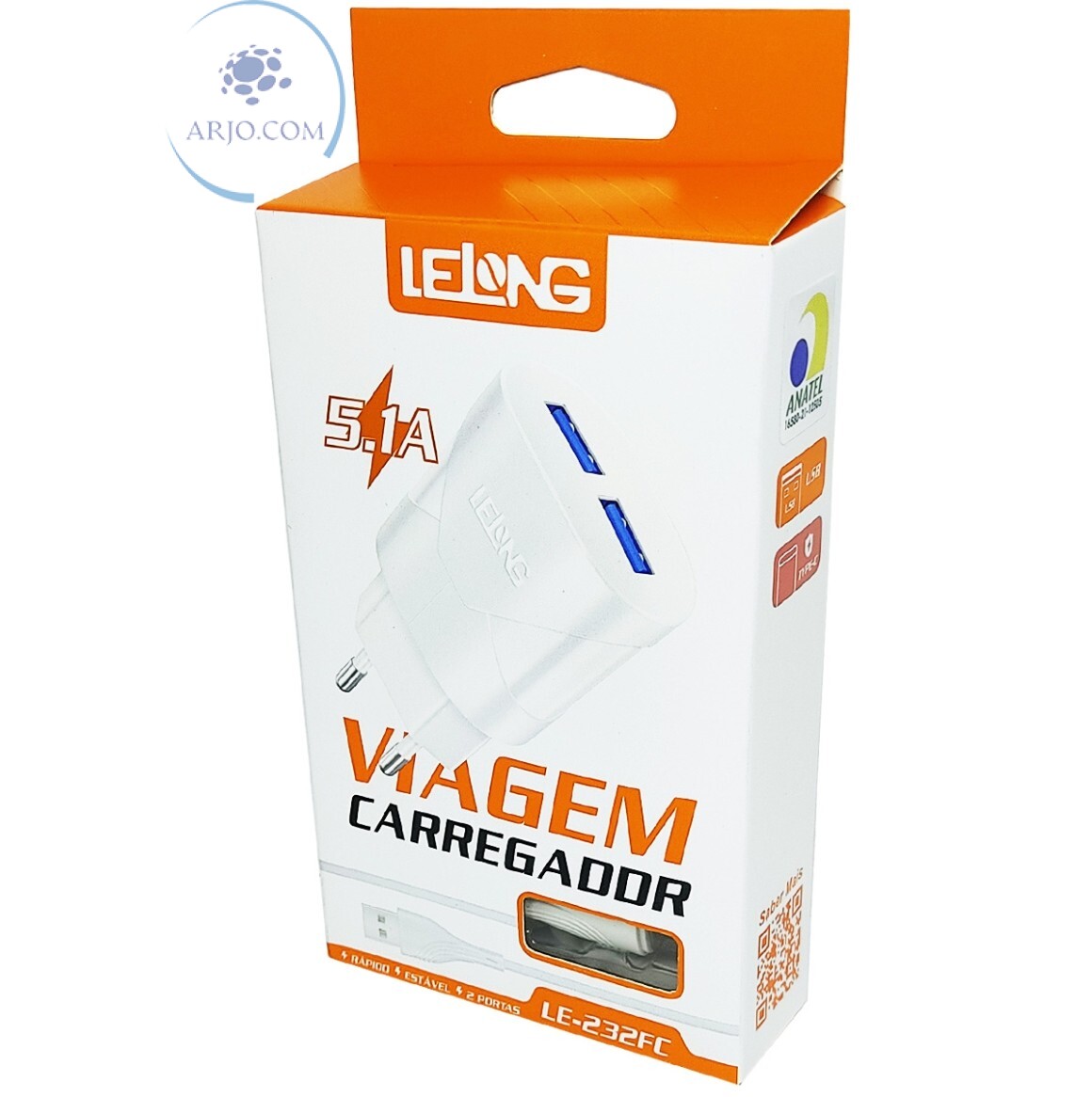 CARREGADOR RÁPIDO COM 2 PORTAS USB 5.1A + CABO TIPO C (LE-232FC)