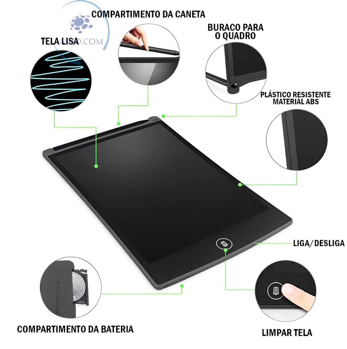 *O QUADRO DE ANOTAÇÕES POSSUI TELA DE 12 POLEGADAS, SENSORES CAPACITIVOS, BATERIA DE LONGA DURAÇÃO, DESIGN ULTRAFINO E TELA LCD. A TELA É SENSÍVEL À PRESSÃO, POR ISSO NÃO EXIGE ESFORÇO PARA USAR, E TUDO PODE SER APAGADO APENAS AO PRECIONAR UM BOTÃO.