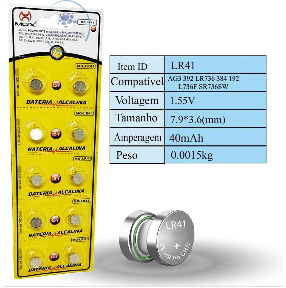 BATERIA LR41 ALCALINA 1,5V CARTELA COM 10 UNIDADES (MO-LR41)